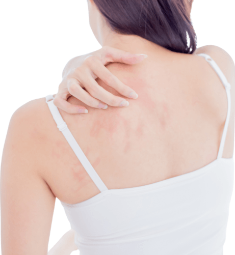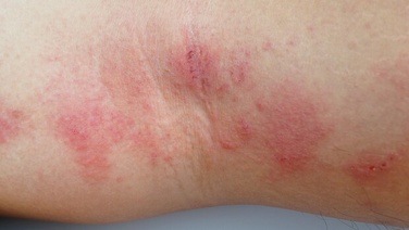 患者的皮膚通常會有紅色斑疹、水泡等發炎現象,並且劇烈搔癢,水泡破裂則會滲水、糜爛。